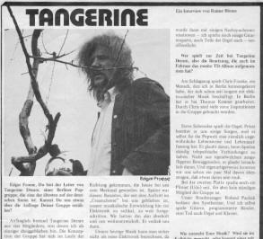 Ein Interview mit Rainer Blome Edgar Froese, Du bist der Leiter von Tangerine Dream, einer Berliner Popgruppe, die eine der ältesten auf der deutschen Szene ist. Kannst Du uns etwas über die Anfänge Deiner Gruppe erzählen? Anfänglich bestand Tangerine Dream aus vier Mitgliedern, von denen ich als einziger übriggeblieben bin. Die Konzeption der Gruppe hat sich im Laufe der Zeit jeweils mit den neu hinzu gekommenen Musikern verändert. Eigentlich hat jeder neue Mann Tangerine Dream neue Impulse gegeben. Am Anfang habt Ihr doch ziemlich normale Rockmusik mit Jazzeinflüssen gemacht. Wie kam's denn dann zu den elektronischen Dingen, die Ihr heute spielt? Im Grunde war das eine ganz komische Begebenheit. Anlässlich eines Auftritts im Düsseldorfer "Creamcheese" 1968 lernten wir einen neuen Bassisten kennen (Kurt Herkenberg?), der unseren regulären Mann wegen Krankheit ersetzte. Er stieg bei uns ein, ohne überhaupt unsere Musik zu kennen. Da auch nicht mehr genügend Zeit war, um ihn einzuweisen, spielten wir mit ihm, ohne eine Ahnung zu haben, wie er spielt. Er brachte eine völlig überraschende und neue Linie ins Spiel. Damals haben wir unterbewußt das gespielt, was wir heute bewußt und intuitiv machen. Wir sind also durch Zufall in die musikalische Richtung gekommen, die heute bei uns zum Merkmal geworden ist. Später war diesem Bassisten, der seit dem Auftritt im "Creamcheese" bei uns geblieben ist, unsere musikalische Entwicklung hin zur Elektronik zu radikal, zu weit fortgeschritten. Wir hatten ihn also überholt und uns weiterentwickelt. Er verließ uns dann. Im Mai des vergangenen Jahres erschien ja eure erste LP, die ELECTRONIC MEDITATION heißt. Wie kam die zustande? Eine eigenartige Geschichte. In einem Privatstudio hatten wir zwei Bänder produziert, von denen wir überhaupt nicht die Absicht hatten, sie auf Platte zu veröffentlichen. Aber der Tontechniker, der uns bei der Aufnahme behilflich war, ging mit den Bändern zum Meisel-Verlag in Berlin. Zu meiner großen Überraschung wurden die Sachen angenommen, aus Gründen, die mir heute noch unerfindlich sind. Es war aber nicht so, wie es oft hingestellt wird, daß ich mit den Bändern zu Herrn Meisel gegangen bin. Die Platte wurde dann mit einigen Nachsynchrononisationen - ich spielte noch einige Gitarrenparts, auch Teile der Orgel nach - veröffentlicht. Wer spielt zur Zeit bei Tangerine Dream, also die Besetzung, die auch im Februar das zweite TD-Album aufgenommen hat? Am Schlagzeug spielt Chris Franke, ein Mensch, den ich in Berlin kennengelernt habe, der sich schon seit langem mit elektronischer Musik beschäftigt. In Berlin hat er bei Thomas Kessner gearbeitet. Durch Chris sind viele neue Inspirationen in die Gruppe gebracht worden. Wie entseht eure Musik? Wird sie im Kollektiv gemacht, oder kommt einer mit einer Idee, und die anderen spielen sie aus? Wir haben am Ku-Damm ein Studio, in dem wir arbeiten und proben können. Für unsere zweite LP haben wir dort fast ein halbes Jahr lang unsere Musik erspielt. Wir haben versucht, unsere Grundeinstellung zu allen umweltbetonenden Dingen in Musik umzusetzen. So daß also der musikalische Entwicklungsprozeß parallel zum Lebensprozeß lief. Wir haben uns sehr oft getroffen und praktisch drauflos gespielt. Daraus hat sich dann im Laufe der Zeit unser musikalisches Gesamtbild entwickelt. Du sagtest, im Februar hättet Ihr euer zweites Album aufgenommen. Was kannst Du darüber sagen? Unser zweites Album heißt ALPHA CENTAURI, der Titel soll gleichzeitig Thema unserer Musik sein: Alpha Centauri ist ein Einzelstern im Alpha Centaurus System, ungefähr 4,3 Lichtjahre von der Erde entfernt. Wir sehen in der Musik Bezugsmöglichkeiten zu kosmischen Öffnungen, also innere Öffnungen, die man als eine Art Spiegel des Kosmos ansehen kann. Ich betrachte mich als kosmische Ausstrahlung, d.h. dass das menschliche Nervensystem im Grunde entmaterialisiert ist, und dass das, was man normalerweise Vernunft oder Geist nennt, nichts anderes als integrierter Bestandteil eines elektromagnetischen Wellenbandes ist. Unser Körper-Geist-Verhältnis ist gleichzusetzen mit dem Verhältnis von Materie und Antimaterie. Unter den Gesichtspunkten verstehen wir auch unsere Musik. Gleichzeitig steht sie auch für eine gewisse Weiträumigkeit: Unsere Musik hat einen Vorder-, Mittel- und Hintergrund, sie ist plastisch, sie klebt nicht am Lautsprecher fest, sondern tritt hervor und wird räumlich. Wenn ich das richtig verstehe, bedeutet das wohl, dass Du inzwischen soweit bist, beim Spielen ohne Denkprozeß auszukommen, dass Du also intuitiv im wahrsten Sinne des Wortes spielst. Stimmt das? Ja, das ist vollkommen richtig. Wenn in Musik ausgedrückte Emotionen über das Körper-Geist-Verhältnis hinaustreten sollen, ist der Prozeß der handwerklichen Umsetzung - also von der Idee zum Spiel - eine starke Bremse. Wir versuchen deshalb auch, die ganzen Instrumente und Apparaturen ihrer normalen Bestimmbarkeit zu berauben, indem wir ihre Handhabung entfremden. Normal heißt ja praktisch Norm, und Norm ist der Anfang von Stagnation. Eure Musik kann man aber doch nicht mit x-beliebigen Leuten machen, also in einer Art Jamsession? Oder glaubst Du, dass das doch möglich ist? Nein. In den letzten zwei Jahren habe ich intensiv Musiker gesucht, mit denen ich echt zusammen spielen kann. In diesen zwei Jahren habe ich vielleicht allerhöchstens zwei oder drei Leute gefunden. Der erste ist der Saxofonist Steve Jolliffe, der bei Steamhammer war und früher auch bei uns gespielt hat. Als ich ihn kurz nach seinem Austritt aus Steamhammer in London traf, war er recht unglücklich, und ich nehme an, dass er wieder zu uns kommen wird. Wie kommt Ihr als "nicht-politische" Band in der "politischen" Stadt Berlin zurecht? Für mich persönlich ist Berlin teilweise die beste, teilweise aber die denkbar schlechteste Stadt. Wir verstehen unsere Musik derart, dass wir ohne ideologische Nebenerklärungen adäquat zur Musik auskommen